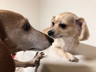 ココアちゃんの日記 2020-08-02 興味津々? おはようございます。 曇り空の日曜日の朝です。 昨日の土曜日もご来店頂いた お客様方々誠にありがとうございます。 本日8月2日は日曜日なので 8:00~13:00までの営業です。 皆様のご来店・お問い合わせを 心よりお待ち致しております。 仲良しのお二人さんも 暑い夏を満喫したいようです。 その前にコっちゃん、ちょっと短めに カットしました。チャー君興味津々? おじさんやめときなさい・・・。